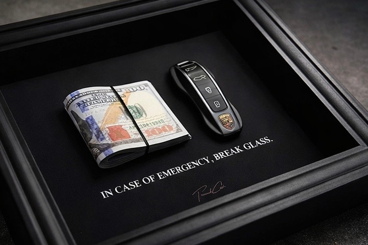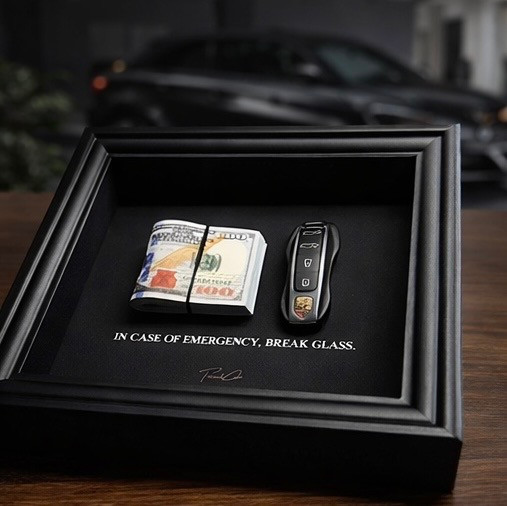 داخل جعبه شامل یک بسته ۵۰ عددی صد دلاری سینمایی و یک عدد ریموت طرح پورشه