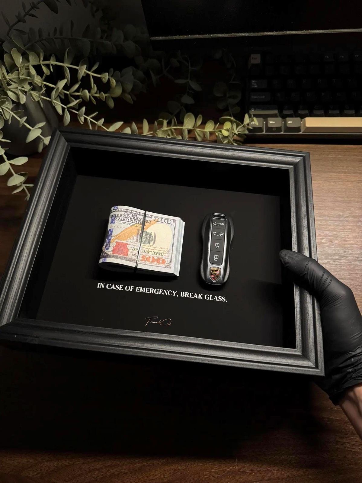 داخل جعبه شامل یک بسته ۵۰ عددی صد دلاری سینمایی و یک عدد ریموت طرح پورشه