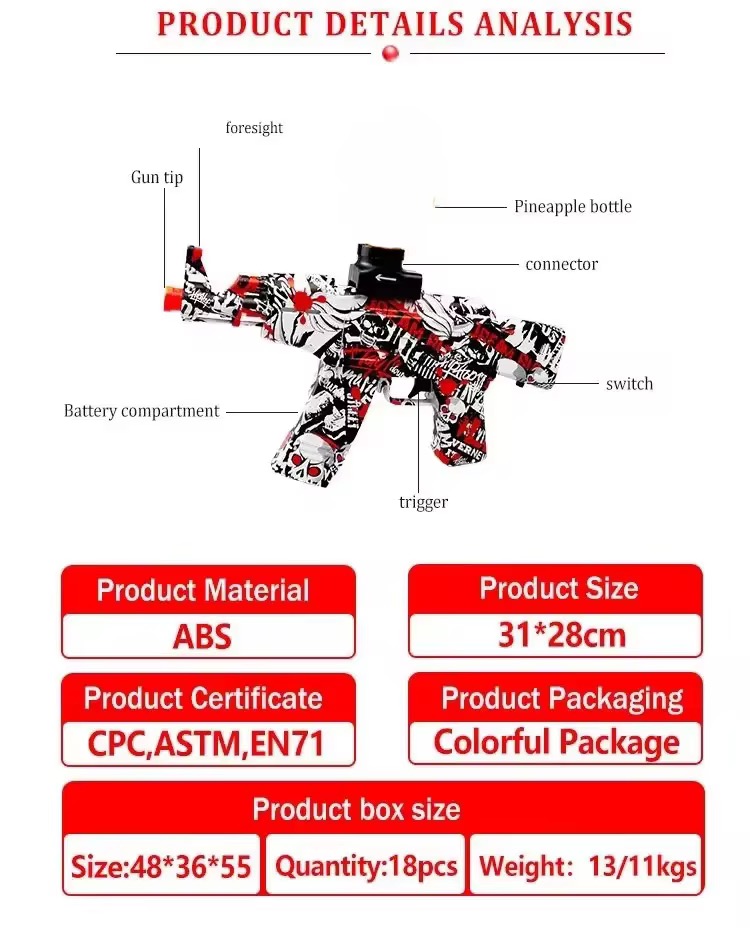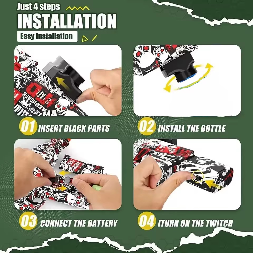تفنگ مهمات ژله ای که با باتری قابل شارژ کار می کند. تا 200 گلوله را در یک زمان با برد بیشتر از 15 متر بارگیری می کند. از مهمات ژله ای 8 میلی متری A-001 استفاده می کند. مهمات ژله ای لک نمی کند و بعد از شلیک تبخیر می شود.شامل تفنگ، خشاب قابل جابجایی ، باتری قابل شارژ، شارژر USB، ظرف با مهمات 300 عددی ساشه 2000 گلوله c/u دارای مهمات برای هیدراته کردن، بند تفنگ و عینک ایمنی. بسیار مهیج، حتی برای افردا بزرگسال.